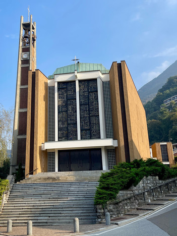 Une autre église, plus contemporaine, se dresse alors, plutôt sinistre. San Zenone. Cela aurait pu être du Botta mais c’est du Mario Savadè (1956). Cet édifice moderne remplace une autre église homonyme près du casino aujourd’hui déconsacrée. J’aurais voulu voir ce que pouvaient donner ses étonnants vitraux de l’intérieur, elle est fermée. Seul le sous-sol est accessible, c’est tout sombre, je ressors en vitesse.
