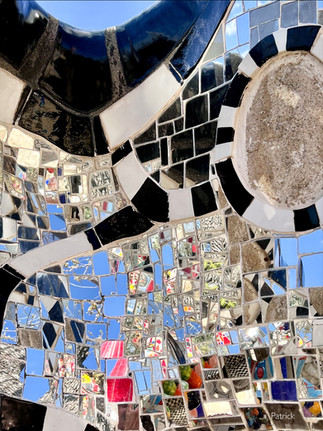 Nous entrons alors dans le Château de l’Empereur, conçu comme une citadelle impériale ornée de tours et de 22 colonnes (le nombre des Arcanes Majeurs) qui supporte une loggia. La structure est dotée d'un chemin de ronde sur lequel nous pouvons monter pour admirer la vue et les oeuvres sous un autre angle. Ici, c'est pléthore de matériaux: verre de Murano, miroirs de France et de Bohême, moulages des visages de tous ceux qui ont collaboré à la création du Jardin. De chaque côté on trouve des détails à admirer. C'est infini comme les reflets qui se perdent dans les multiples miroirs. On est dans un petit parc Güell. Au centre trône l’Assiette-Fontaine.