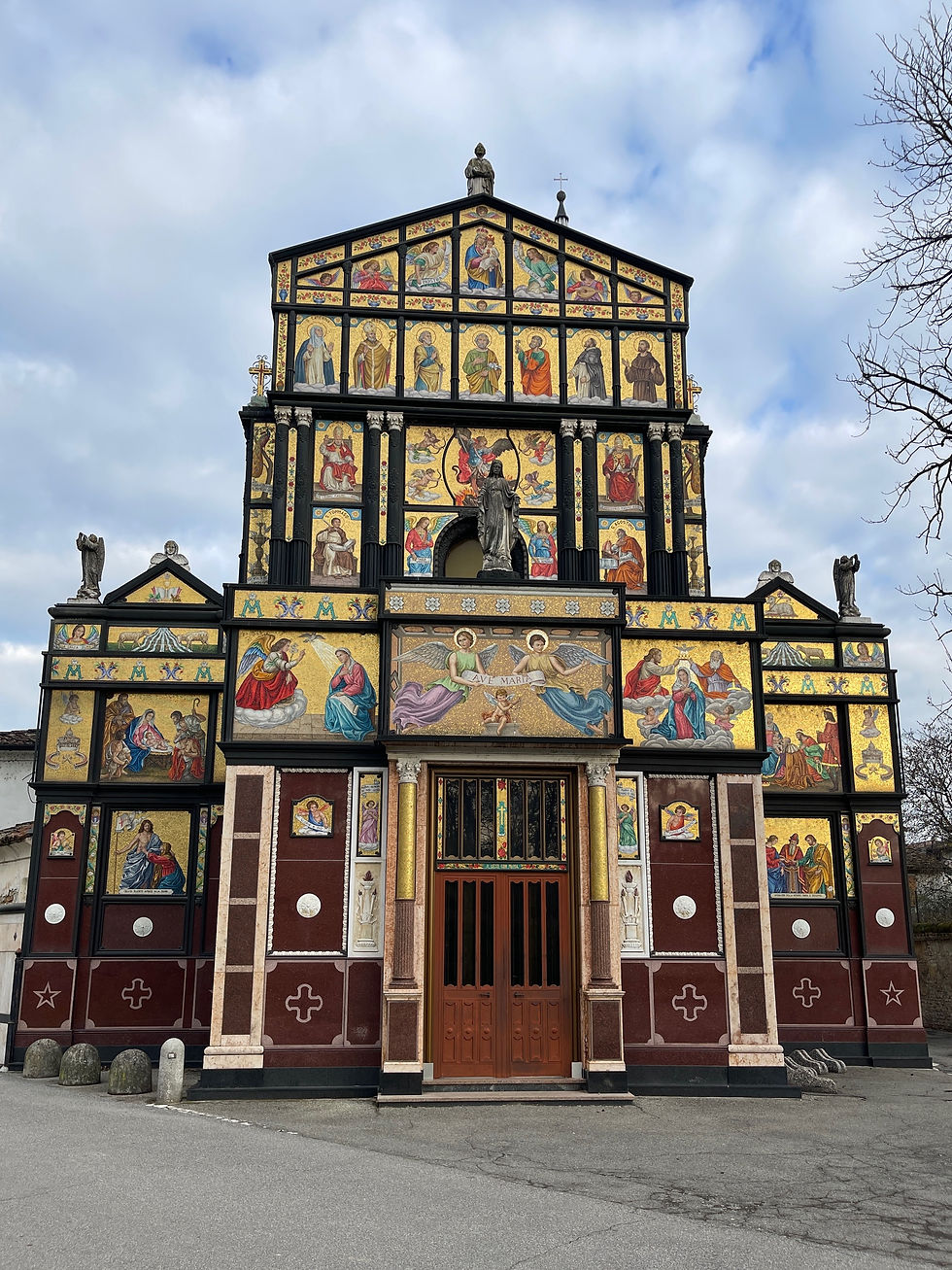 Contrastant avec cette austérité se dresse la fameuse église de San Pietro. En 1945, à la suite d’un raid aérien anglo-américain visant les ponts sur l’Adda, toutes les maisons autour de l’église furent détruites mais l’édifice resta intact. Le prêtre attribua ce fait à la protection de la Vierge Marie et entreprit dès lors de le décorer de mosaïques inspirées des peintures de la Renaissance. L’intérieur est également richement apprêté mais ne se visite que sur rendez-vous.