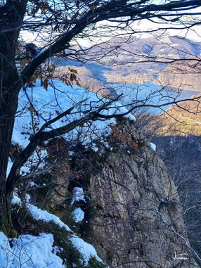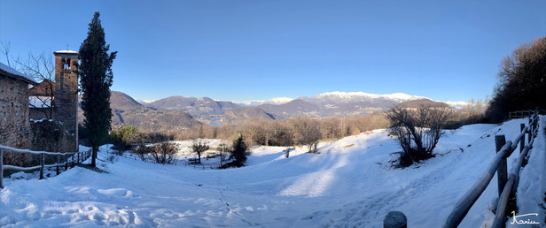Assis dans un pré blanc et scintillant, nous profitons quelques instants du soleil, enfin, car il faut préciser que ce versant est peu exposé et que nous sommes un matin d'hiver. En contre-bas, deux chevaux nous surveillent du coin de l'oeil et plus loin nous plongeons vers Ponte Tresa Lavena et le lac qui se resserre vers le Monte Caslano. Derrière les murs de Torello, un bipède et une voiture enneigée me font penser que les habitants doivent avoir quelques réserves de pâtes et de PQ. L'accès ne peut se faire que par le chemin que nous venons d'emprunter.