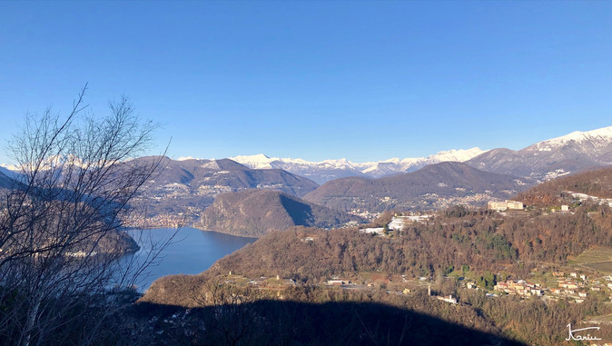 Afin de retrouver le soleil et plonger dans un autre bras du lac de Lugano, nous nous dirigeons vers le Parco San Grato, jardin botanique dans lequel on peut emprunter divers sentiers thématiques (mais pas très facilement en cas de neige, seul le parcours principal est praticable) et d'où l'on a une vue impressionnante sur le lac, le San Salvatore et Carona accrochée à ses flancs ou encore la digue de Melide.